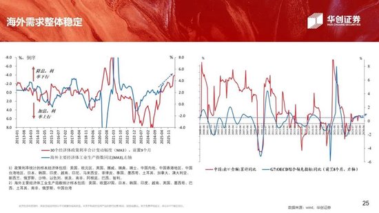 第二个判断,是海外需求前景稳定。无论是从海外降息角度看利率合计变动对工业生产的领先性,还是看G7的OECD综合领先指标对中国出口的领先性,至少我觉得未来七八个月整体是稳定的,特别是美国提前降息,本质上是领先利率曲线、提前去做了经济空中加油,我们觉得今年中国出口的增速韧性还是很强的。