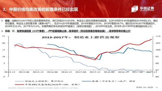 下面这张图,当年2015~16年,也是从2015年1月份开始,浅蓝色的线一直到16年年初形成供需双弱、但供给掉的更快,到2016年年中PPI定基指数止跌了,后面的涨价,就完全是跟着基建和地产的终端需求来走了,这是一个非常重要的经验。