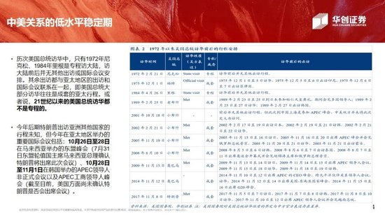 第一个判断,是中美关系进入低水平稳定期。之前有对等关税,明年有中期选举,目前市场在期待美国总统访华,从历史经验来看:两国元首会面,基本上都能期待前后一段相对的低水平稳定期。会面这个时点如果和亚洲的重大会议节点嵌套的话,合理预期很有可能是10月底或11月初。那么到明年两会之前,一个低水平的稳定期或可出现。当然中美关系是动态的,这一点需要持续观察和动态调整。