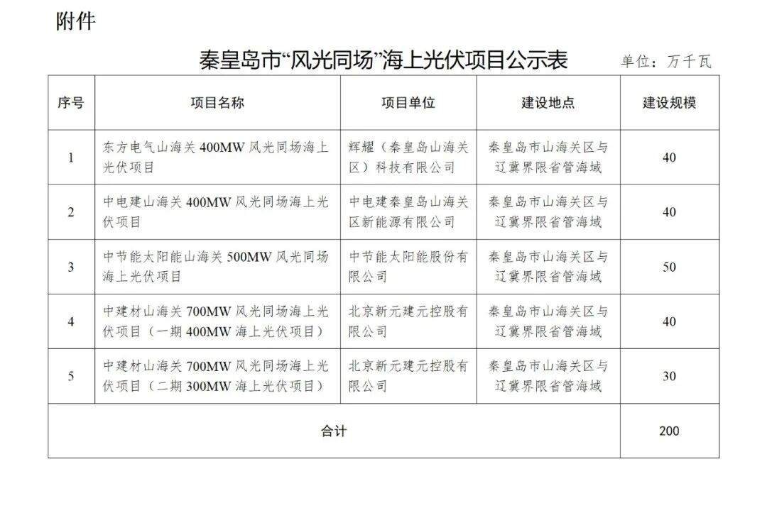 根据《关于抓紧谋划海上光伏项目的通知》(冀发改能源〔2025〕795号)要求,经秦皇岛市申报、电网公司对接入和消纳条件确认及第三方咨询单位对基本要件审核,现对符合用海条件且电网公司出具支持意见的海上光伏项目予以公示。本次拟公示项目共5个、200万千瓦。具体名单见附件。