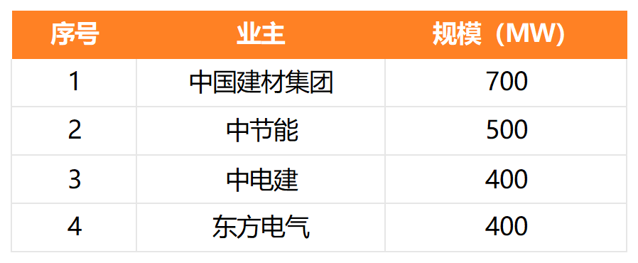 从项目业主情况来看,中国建材集团所获规模最大,共700MW,中节能获500MW,中电建及东方电气各获400MW。